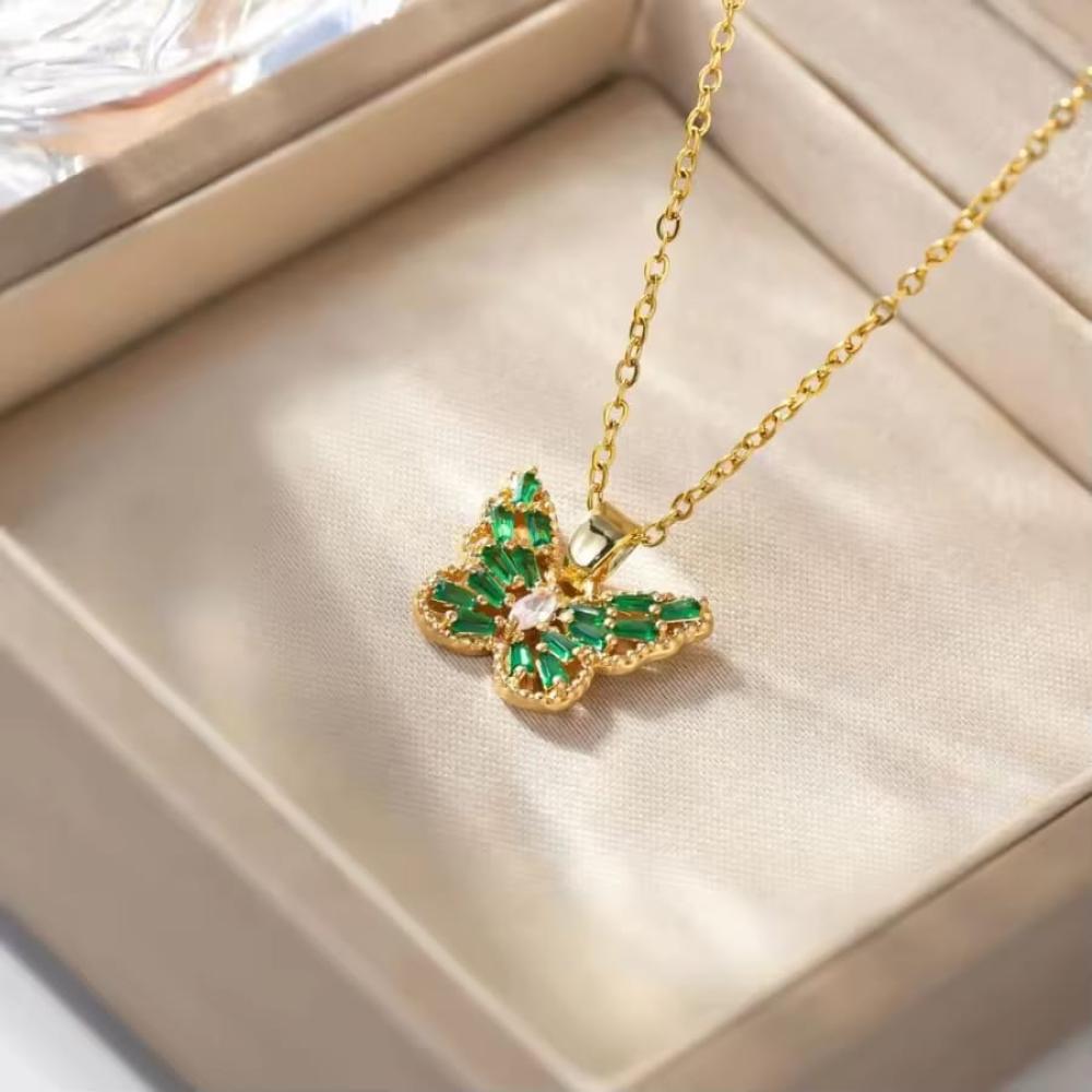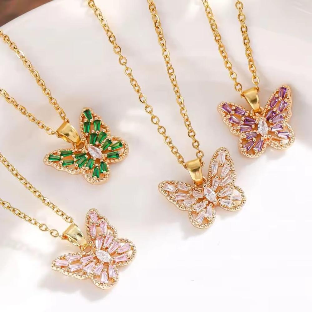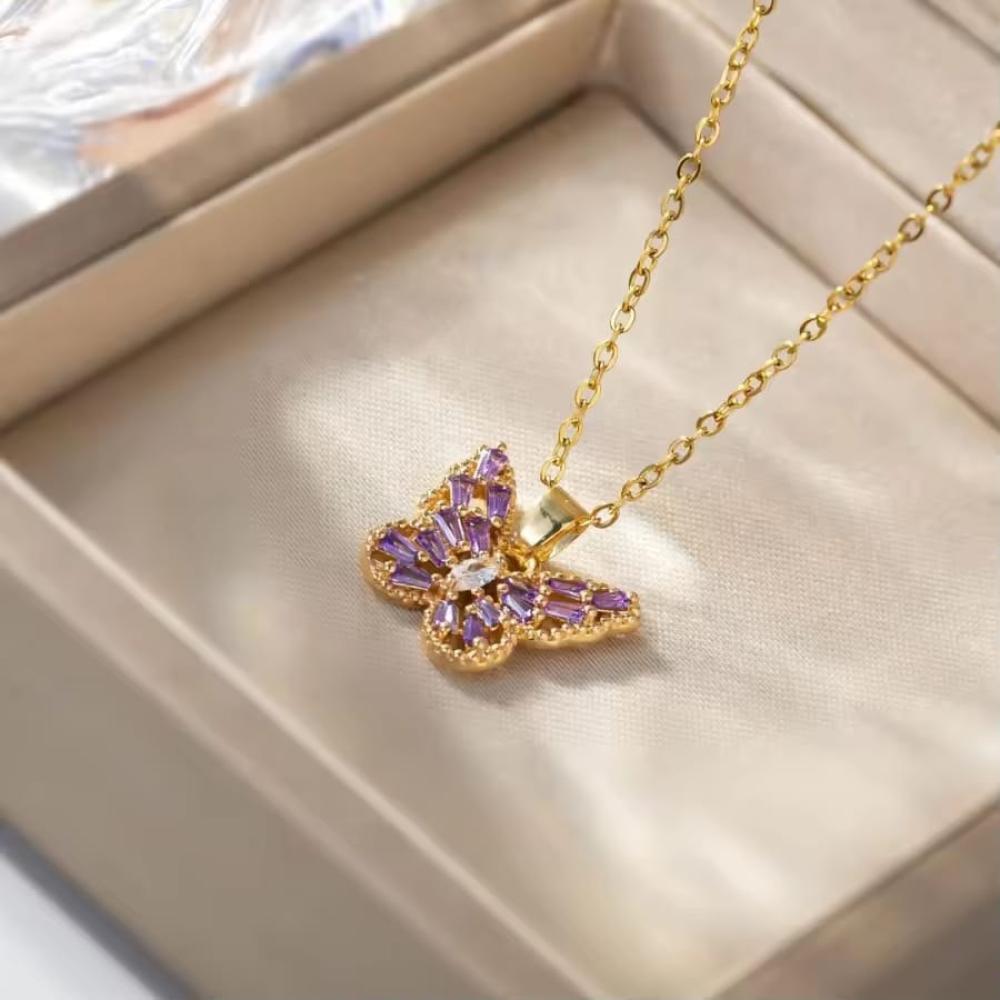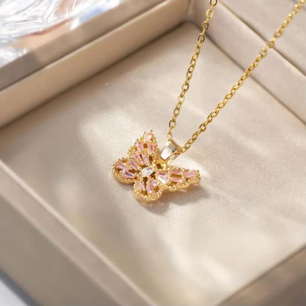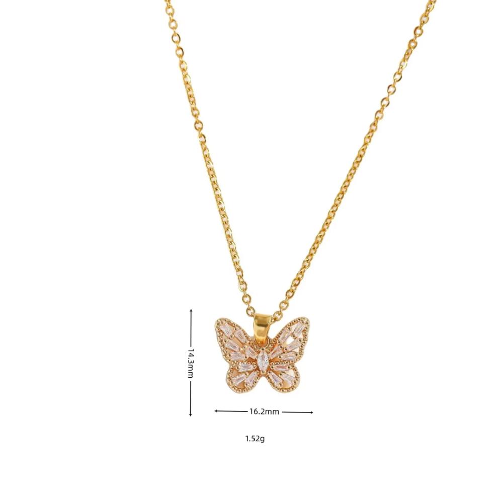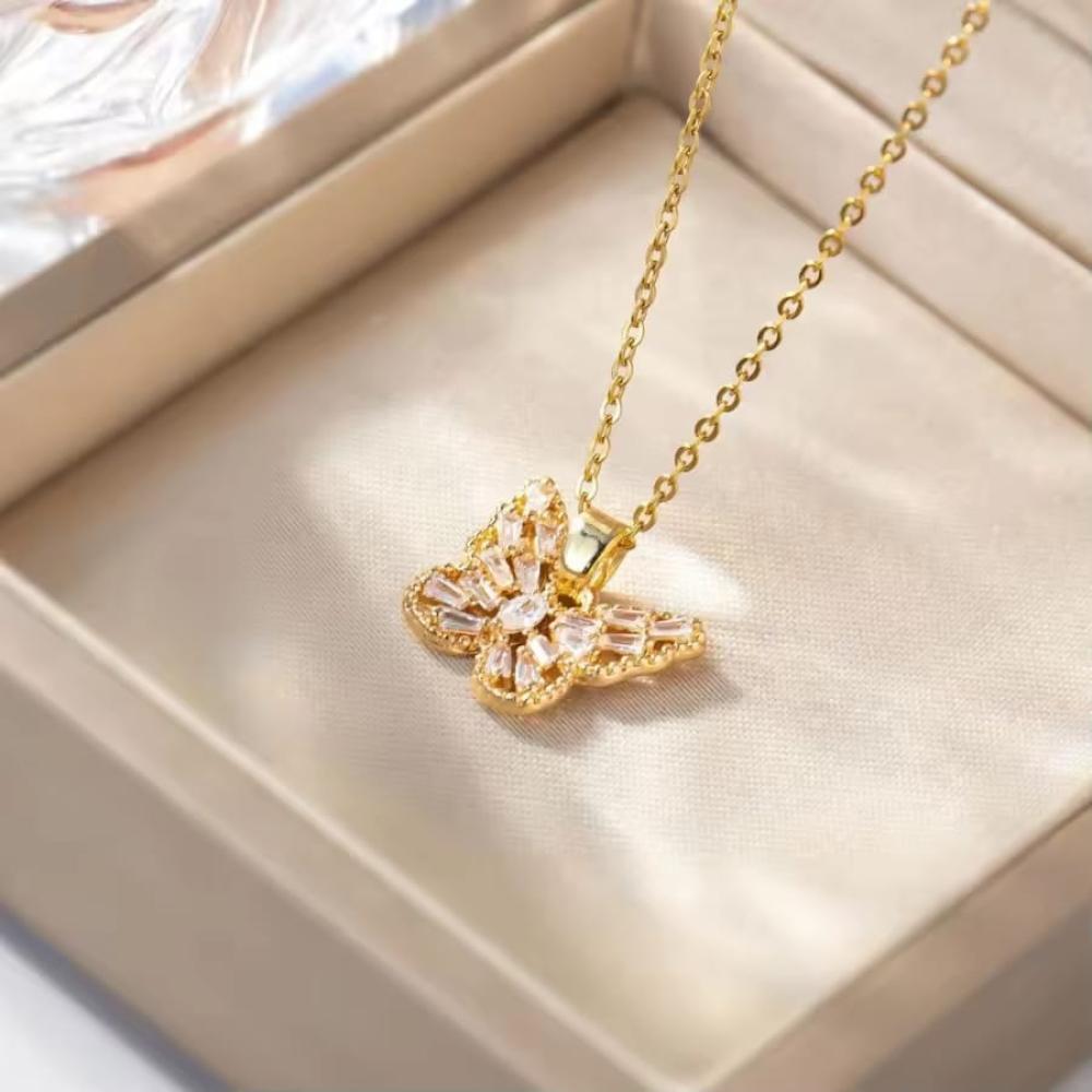ضيفي لمسة رومانسية وفاخرة إلى إطلالتك مع هذا السلسال المميز على شكل فراشة مطلية بالذهب، مزين بقطع زركون براقة تعكس جمال التصميم وتألقه في كل مناسبة.